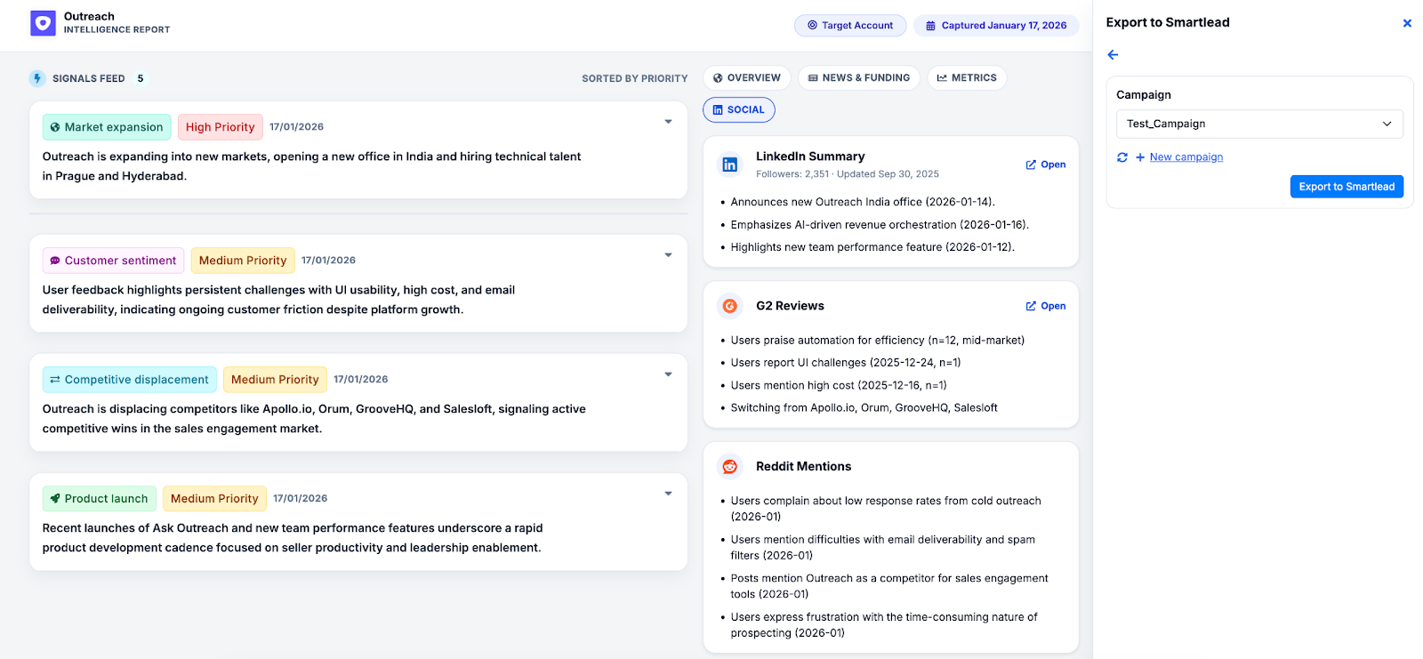 Teams can turn account signals into personalized email and LinkedIn copy that can be pushed into Smartlead in minutes.