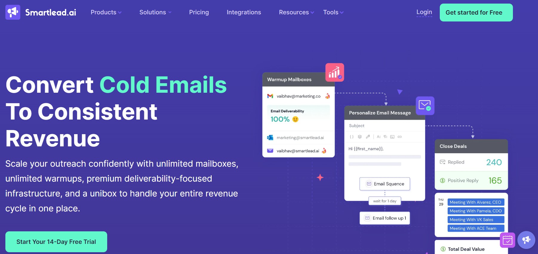 Smartlead's cold email outreach tool helps businesses scale their outreach efforts seamlessly. With unlimited mailboxes, fully automated email warmup functionality, a multi-channel infrastructure, and a user-friendly unibox, it empowers users to manage their entire revenue cycle in one place. Whether you're looking to streamline cold email campaigns with automated email warmups, personalization fields, automated mailbox rotation, easy integrations, and spintax, improve productivity, or enhance scalability with subsequences based on lead’s intentions, automated replies, and full white-label experience, our cold email tool implifies it in a single solution.
