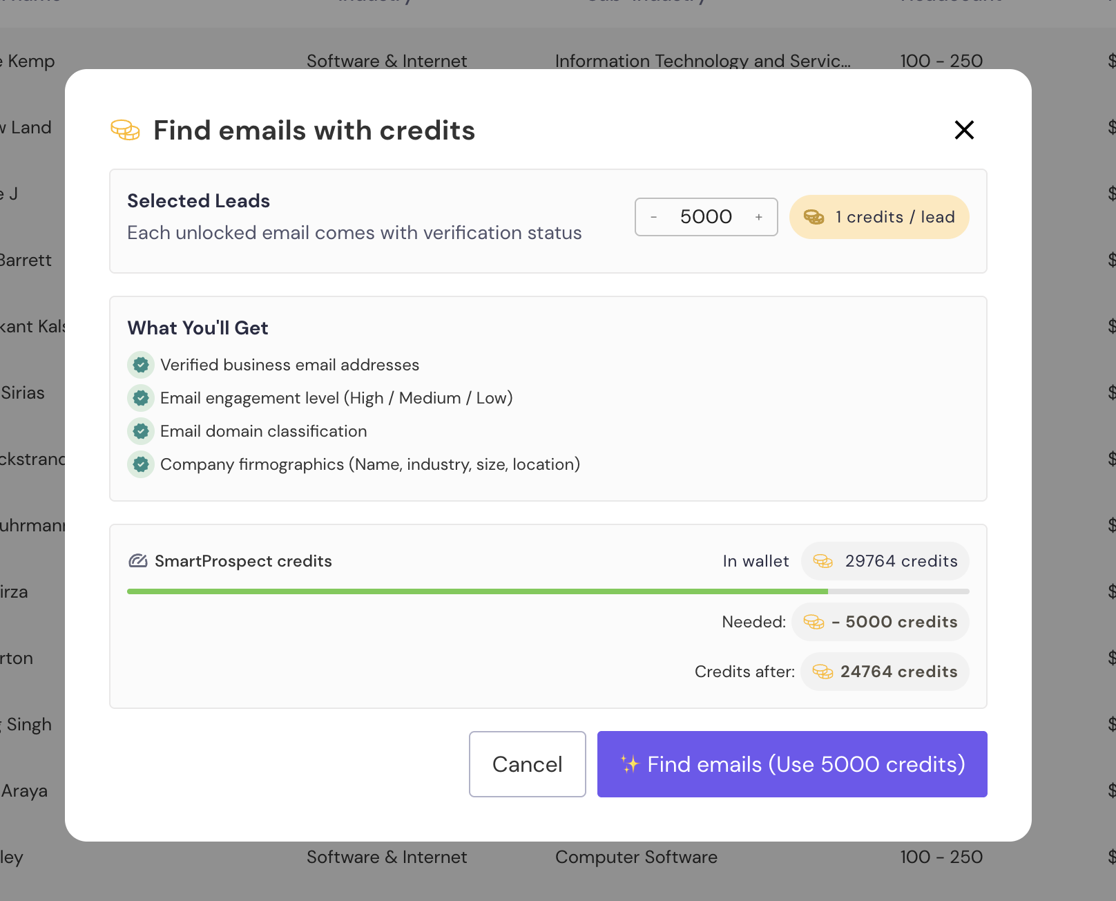 If you’re on a Custom_60K leads plan, you can access up to 60,000 verified leads using SmartProspect for the flat fee of $59/month.