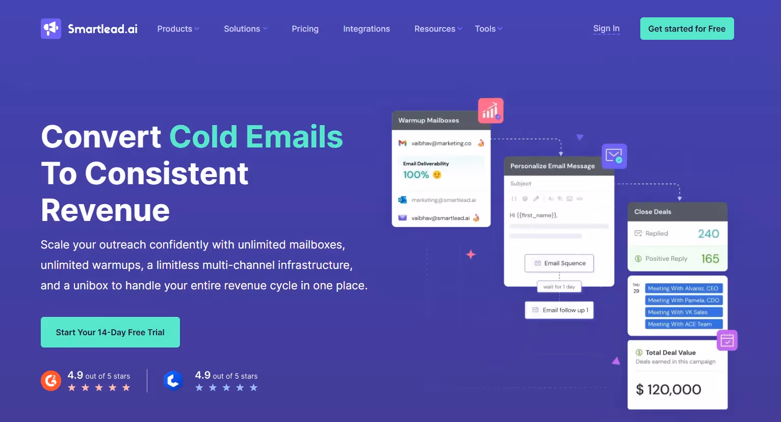 Smartlead's cold email outreach tool helps businesses scale their outreach efforts seamlessly. With unlimited mailboxes, fully automated email warmup functionality, a multi-channel infrastructure, and a user-friendly unibox, it empowers users to manage their entire revenue cycle in one place. Whether you're looking to streamline cold email campaigns with automated email warmups, personalization fields, automated mailbox rotation, easy integrations, and spintax, improve productivity, or enhance scalability with subsequences based on lead’s intentions, automated replies, and full white-label experience, our cold email tool implifies it in a single solution.