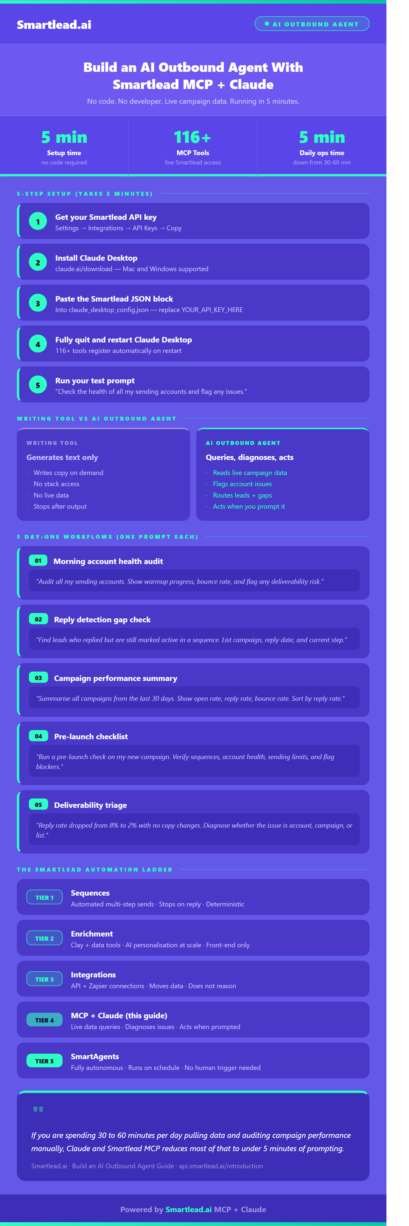 Setup time is 5 minutes and the only prerequisites are a Smartlead account and Claude Desktop.