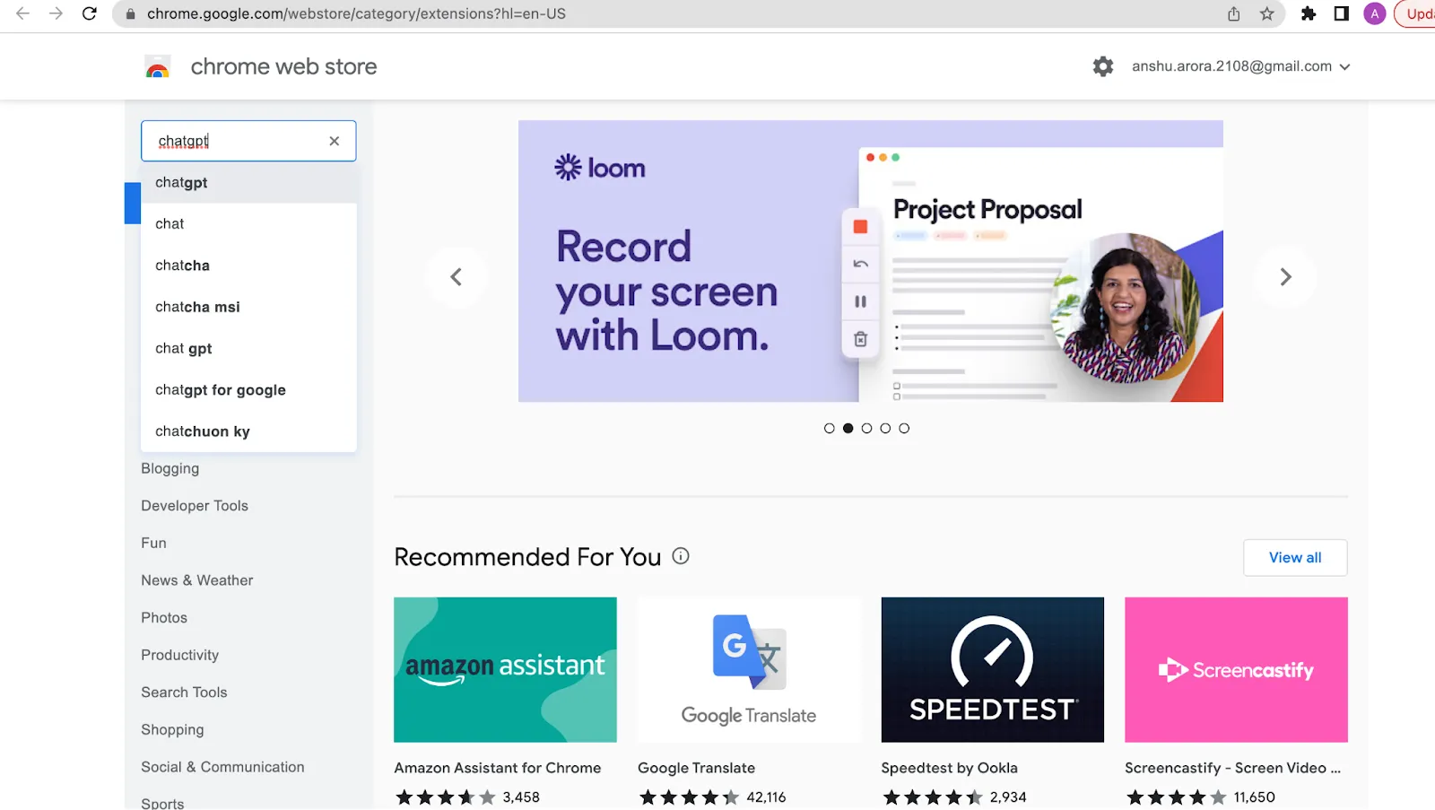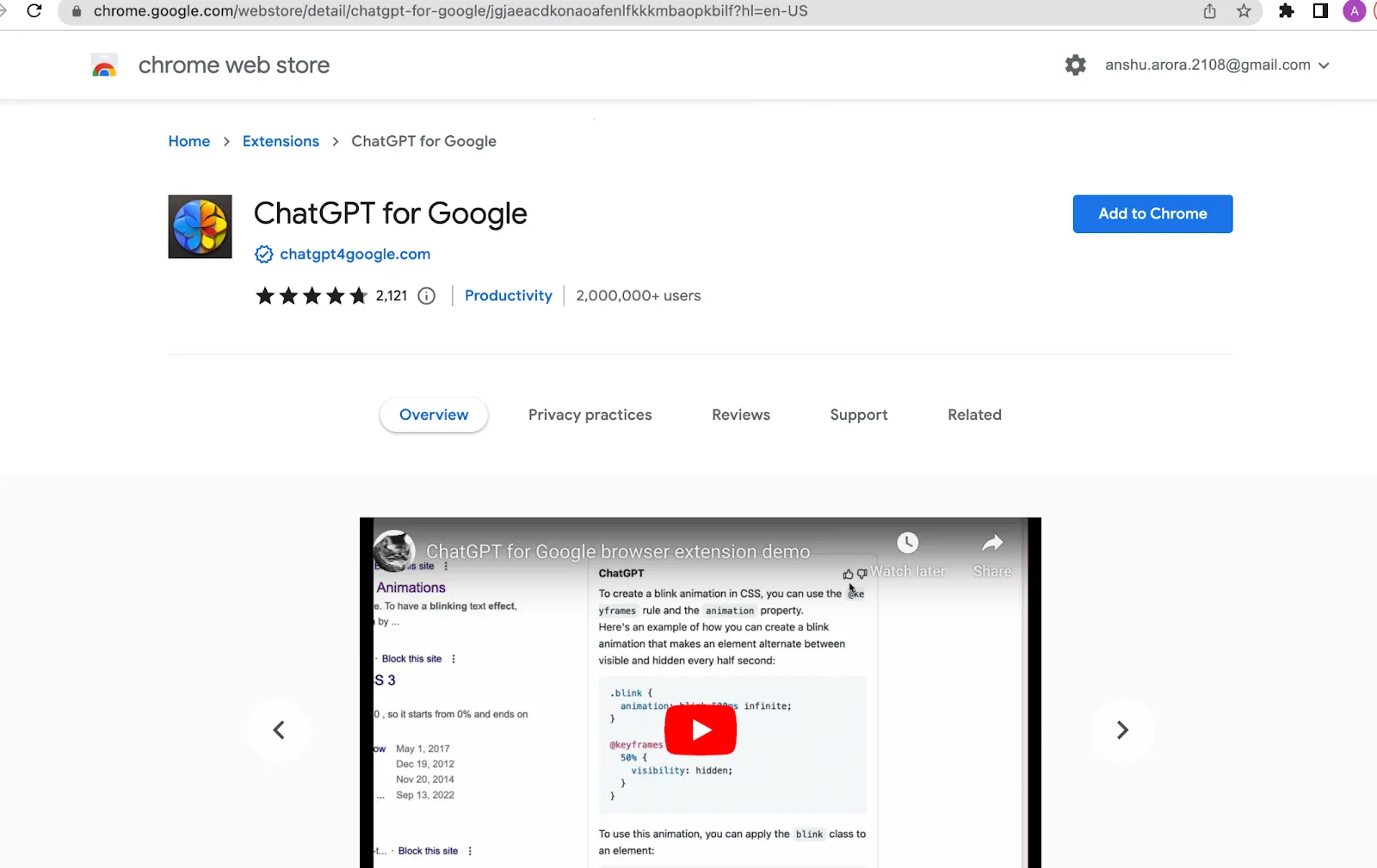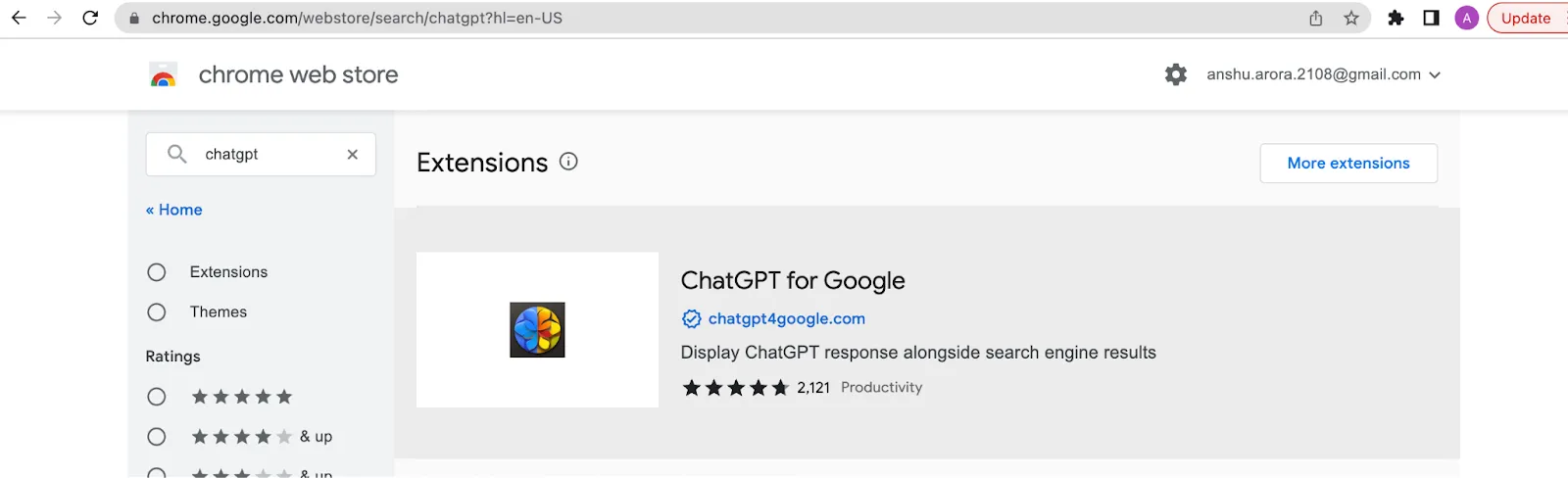 - Search for ChatGPT: Type "ChatGPT" in the search box and select the "ChatGPT for Gmail" extension.