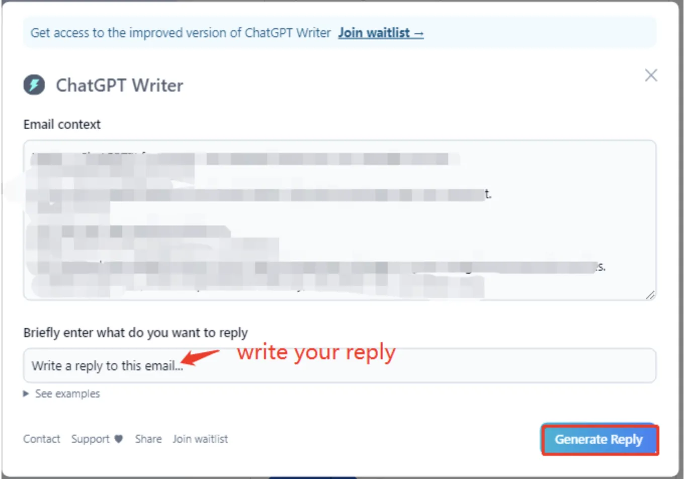 - Generate Reply: Once logged in, type the context you want to write in the "Briefly enter what you want to reply" section and click on "Generate reply/email."