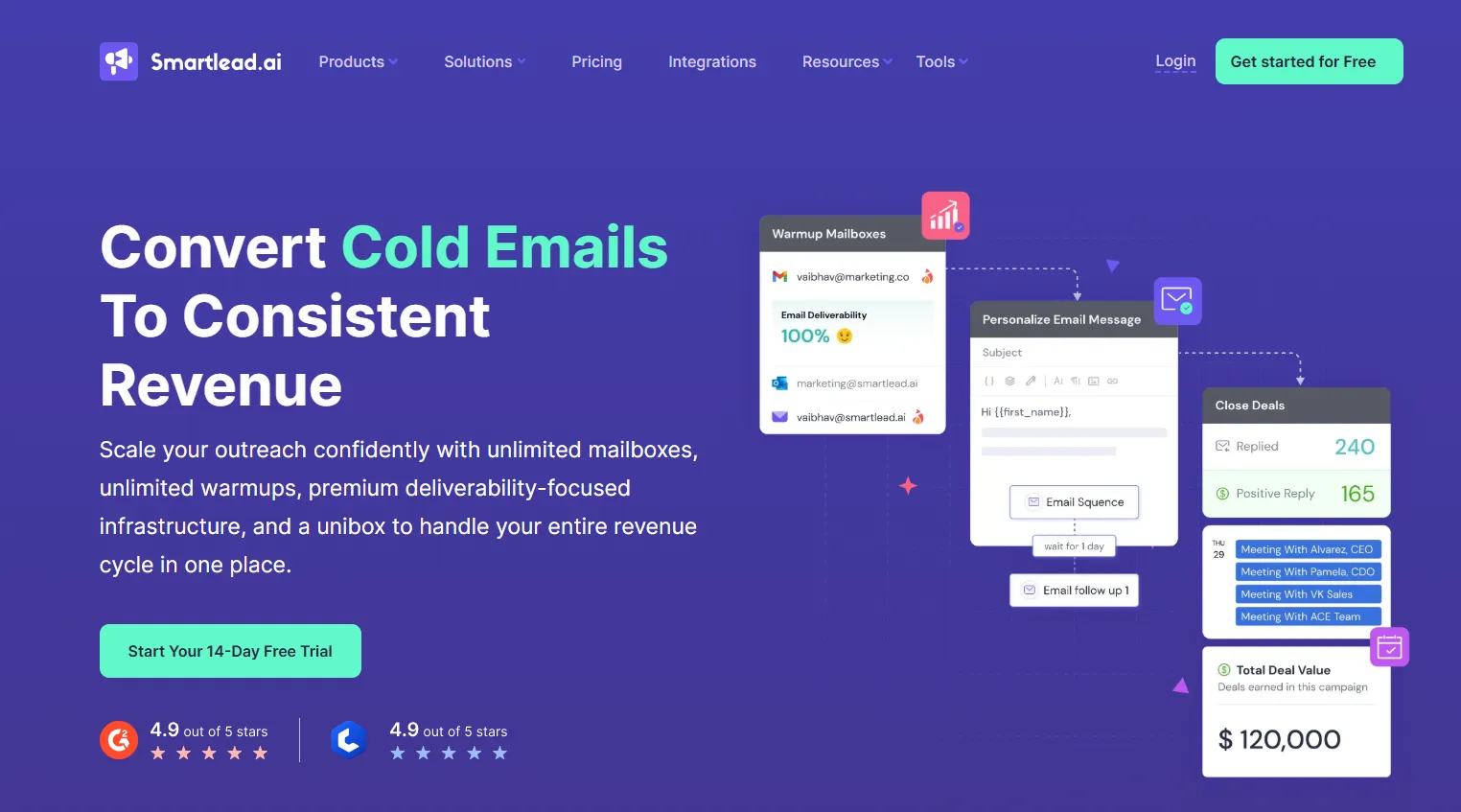 Smartlead's cold email outreach tool helps businesses scale their outreach efforts seamlessly. With unlimited mailboxes, fully automated email warmup functionality, a multi-channel infrastructure, and a user-friendly unibox, it empowers users to manage their entire revenue cycle in one place. Whether you're looking to streamline cold email campaigns with automated email warmups, personalization fields, automated mailbox rotation, easy integrations, and spintax, improve productivity, or enhance scalability with subsequences based on lead’s intentions, automated replies, and full white-label experience, our cold email tool implifies it in a single solution.