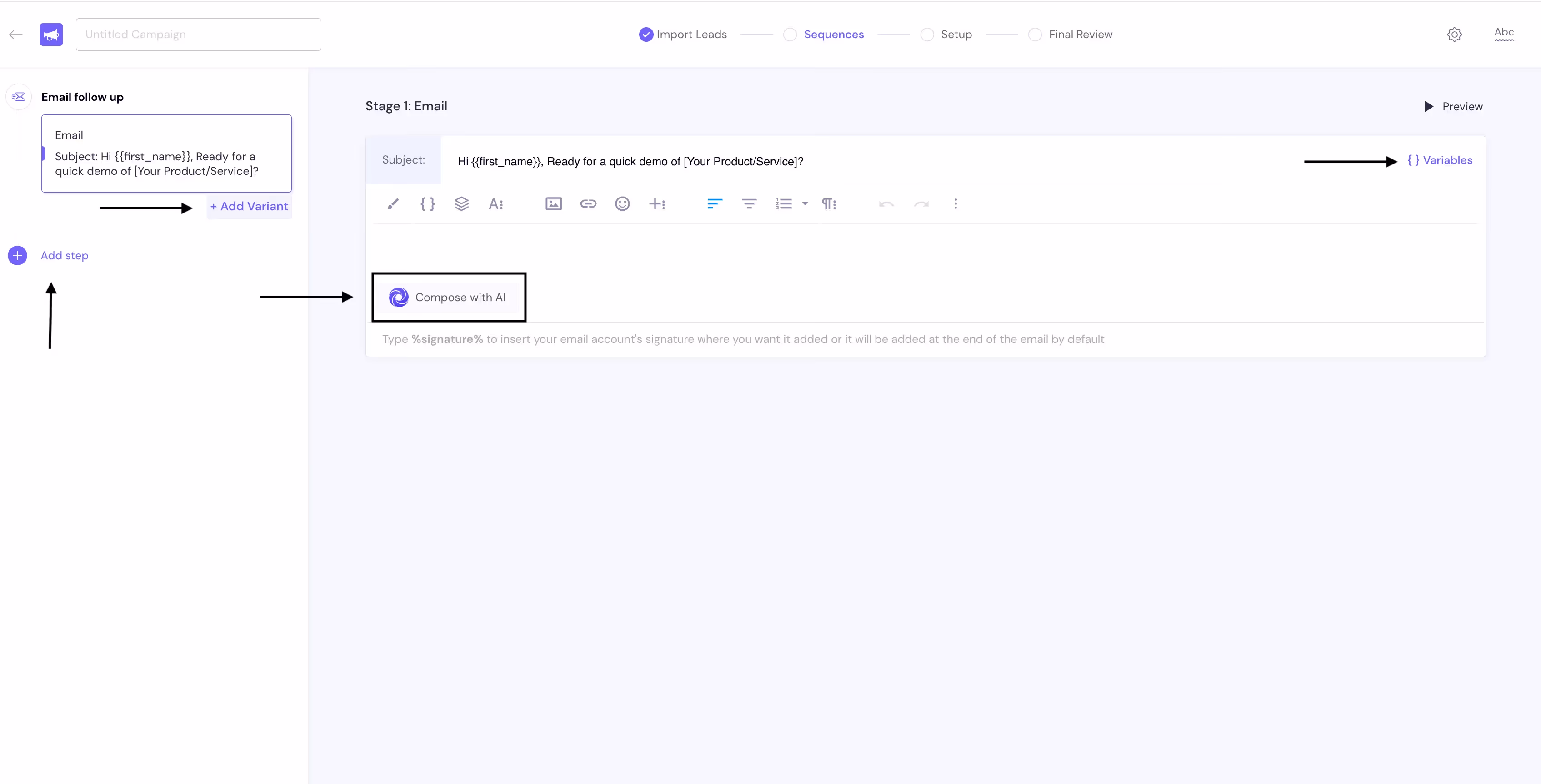 - Use Smartlead’s A/B testing to experiment with subject lines and copy variations