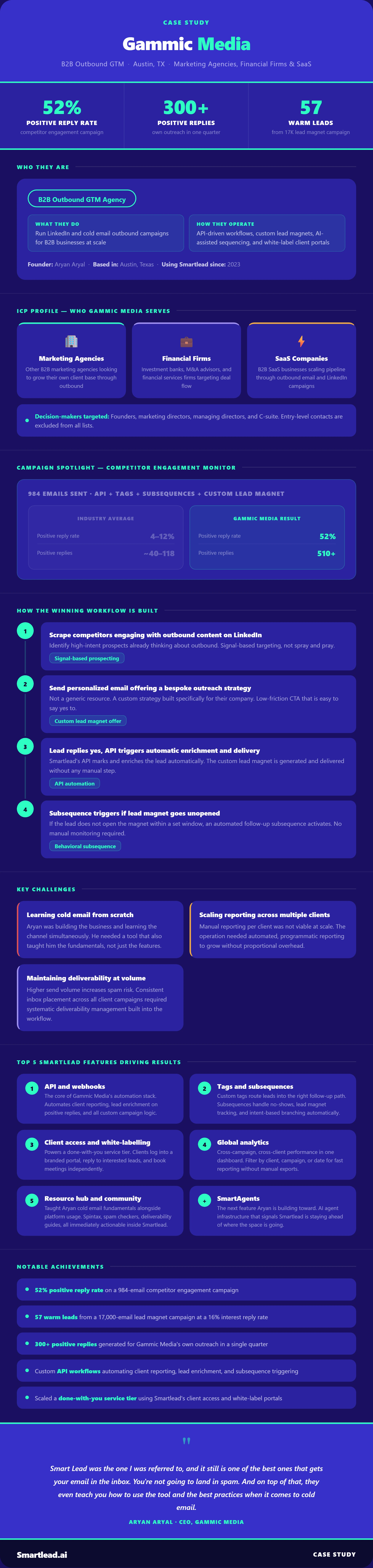 That was around 2023. Today, Gammic Media runs Smartlead as its central outbound platform, has built custom API workflows on top of it, and generated over 300 positive replies for their own business alone in a single quarter, in addition to running campaigns for their full client base.