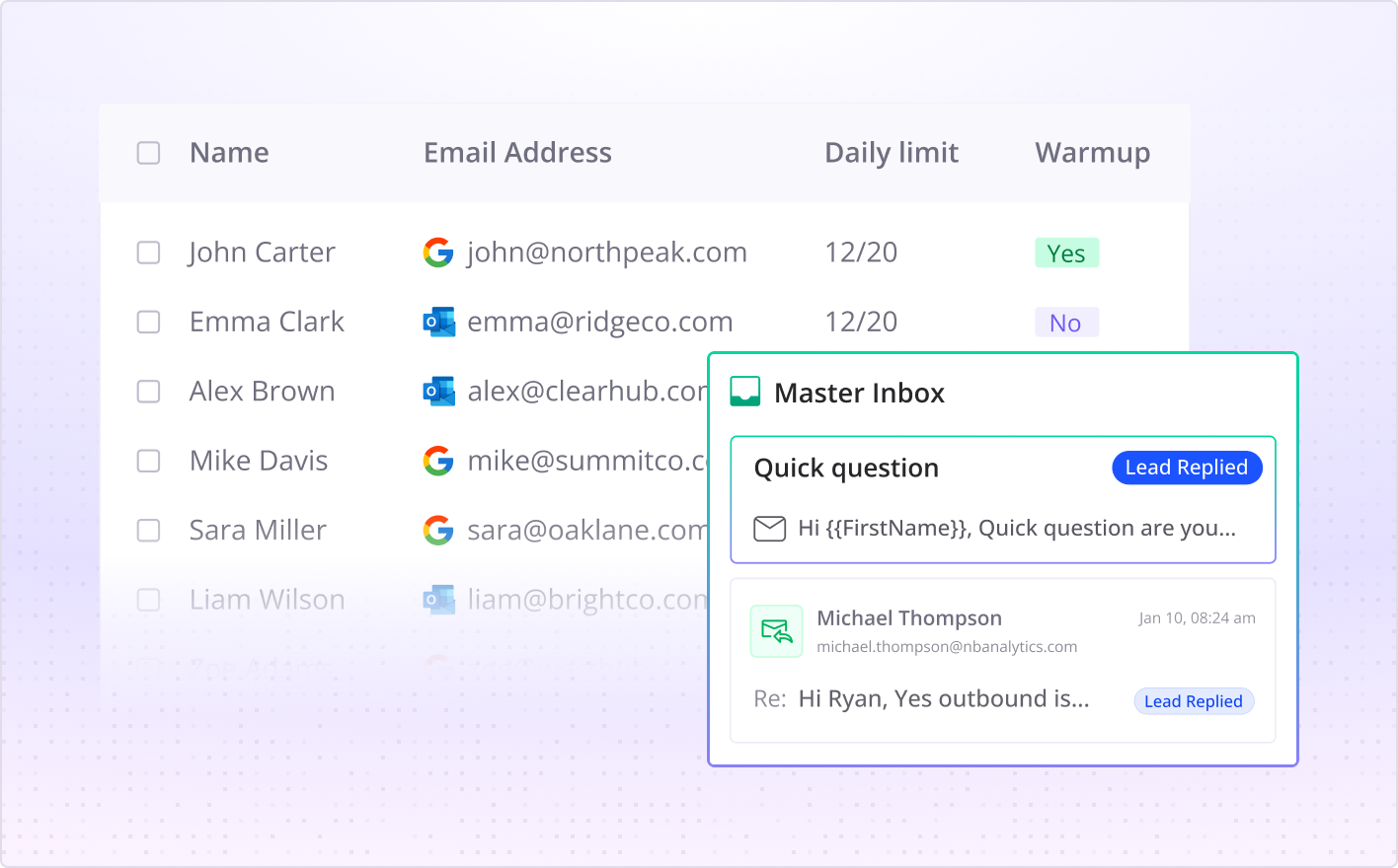 DNS configuration, inbox creation and warmup are all handled behind the scenes, so you can focus on outreach, not setup